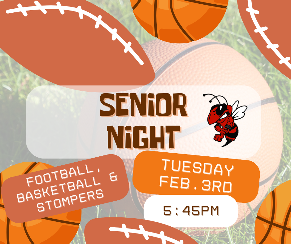 🐝⚡ SENIOR NIGHT – TUESDAY, FEBRUARY 3RD ⚡🐝We’re honoring our Senior Football Players, Basketball Players, and Stompers!Come out at 5:45 PM and show your support for our Senior Hornets.🏀 Hornets vs....